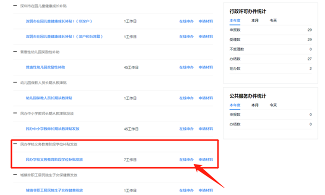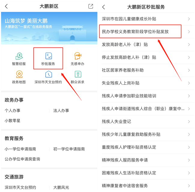电脑端申报,学生家长须登录广东政务服务网(https://www.gdzwfw.gov.cn/),在页面顶端点击“切换”按钮,选择“深圳市→大鹏新区→新区教育卫健局”;点击“行政给付”,选择“民办学校义务教育阶段学位补贴发放”,点击“在线申办”,按要求填写相关信息后,提交申请即可。