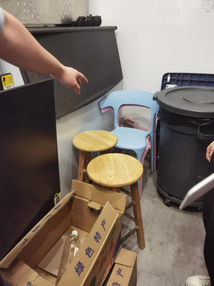 在后厨的一处架子上,记者注意到该店员工的个人物品与食材堆放在一起。执法人员指出,员工的个人物品应与食品分开放置,防止污染。