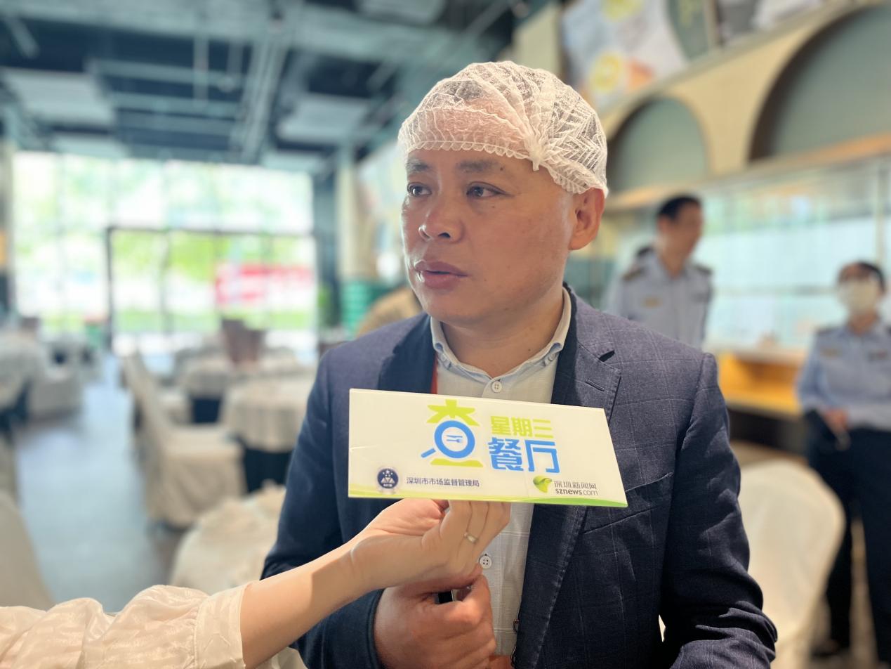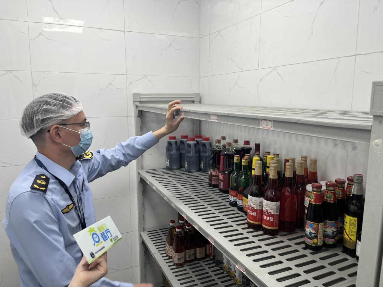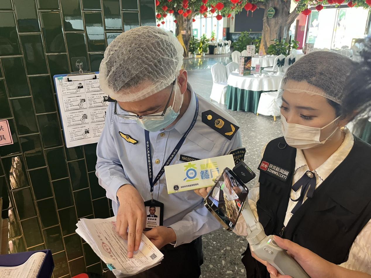 根据食品安全相关法律法规,执法人员依次对该餐厅的证照资质、后厨卫生、标签标识、索证索票等情况进行检查。本次出镜的执法人员是来自深圳市市场监督管理局光明监管局的曾剑威、刘文军。