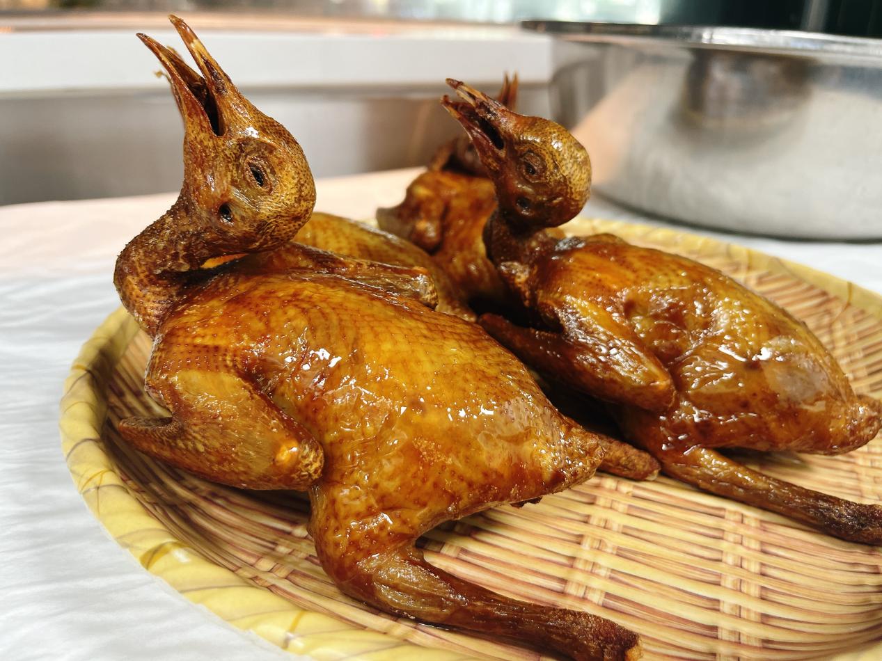 在现场,光明招待所的厨师师傅展示了该店特色招牌菜——红烧乳鸽。经过整整1分钟160摄氏度恒温油炸后,皮脆肉嫩的乳鸽就出炉了。
