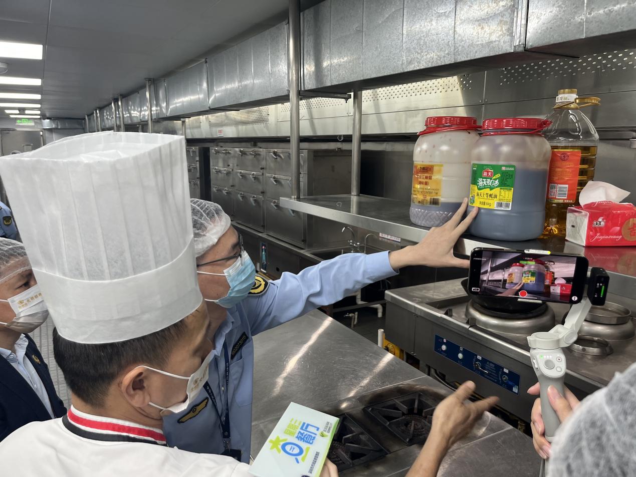 进入后厨,执法人员对标签标识、食品存储等各项细则进行查看。曾剑威指出,该餐厅整体情况较好,例如刀具砧板进行颜色区分管理,调料区及冰柜标签标识较清晰,后厨人员按照规定未留长指甲、未佩戴首饰。但仍有部分细节问题需要改进,如开封后的蚝油未及时进行冷藏保存、餐具存放柜及洗菜间水池未标注用途、食品仓库标签不清晰等。