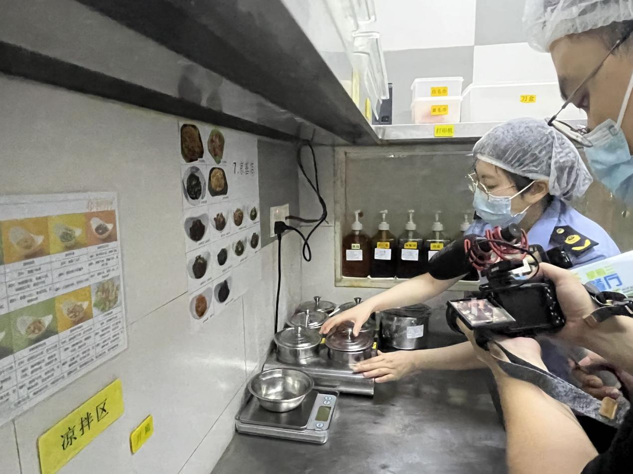 执法行动进行的同时,快检人员也来到现场对食材进行抽检。据介绍,本次共抽检8批次食材,包括食用油、大米、腊肠、腊肉、午餐肉、鸡肉、皇帝菜、生菜,检查结果均合格。