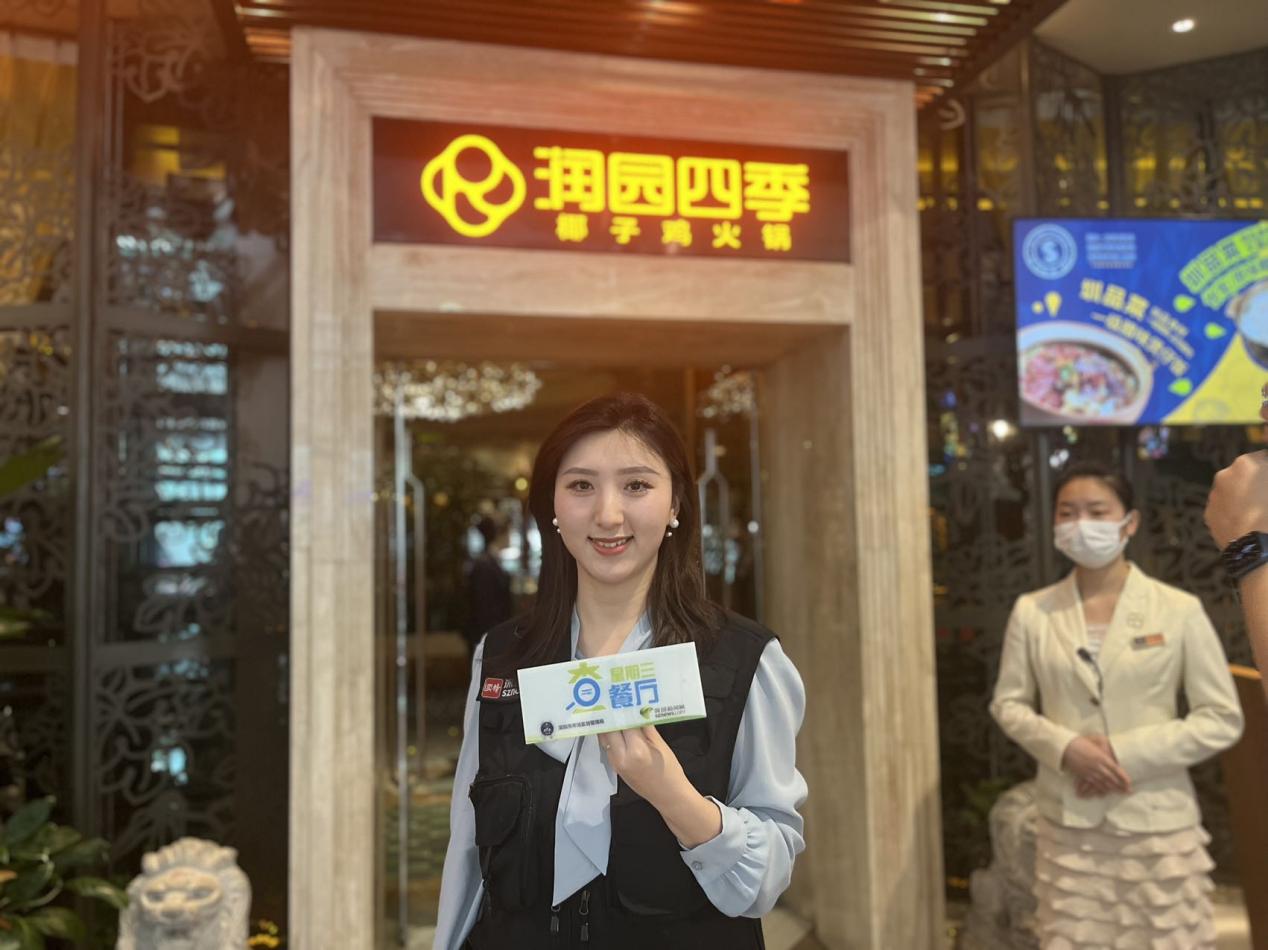 此外,记者注意到,餐厅在入口和用餐区域均张贴了“光盘行动,拒绝‘?!纭钡暮1?。餐厅负责人介绍道,为响应“提倡节约,反对浪费”的号召,润园四季椰子鸡的菜品有“大小份”供顾客选择;点餐时,服务员会主动提醒菜品份量,倡导理性消费,按需点餐;用餐完毕后,若有剩余菜品,会提示顾客进行打包,拒绝浪费。