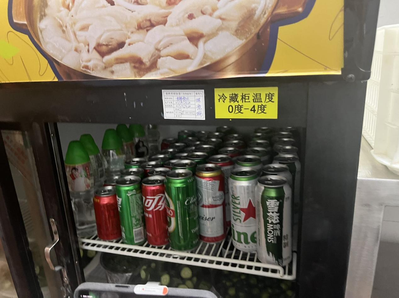 在贴有椰子水专用标签的冷藏柜中,存放了罐装饮料及其他食材。
