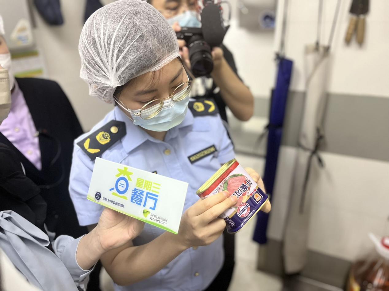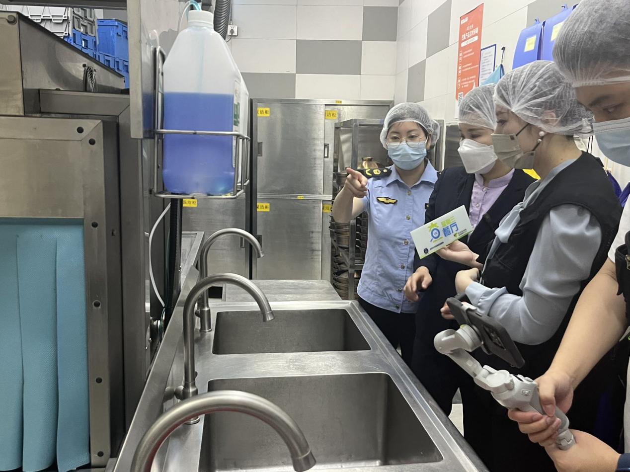 穿戴防尘帽后,执法人员一行进入后厨,依次查看仓库、操作区、储藏区、冷食专间、洗消区等。经检查,后厨整体情况良好,分区合理、设施完备。仓库中随机抽查的午餐肉、酱油均在保质期内且隔墙离地存放;专间配置自动开合门与紫外线消毒灯;操作区域分区明确;冷柜中的肉类、椰子水等食材标签较完善。