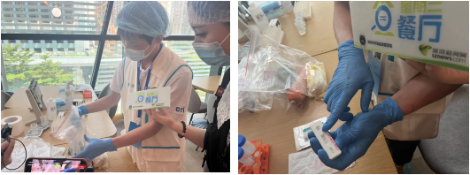 佩戴发套和口罩后,执法人员一行进入后厨检查。执法人员表示,该餐厅后厨区域分区合理,砧板以颜色区分,食材按要求存储,地面干燥,卫生良好。由于该餐厅经营范围包括生食类,后厨设有相应的冷食专间。执法人员对该专间进行重点检查。经查,专间配备感应洗手池、洗手消毒液、烘干机及电动开合门,专间内砧板以颜色区分,食材均标注日期且在保质期内。执法人员建议,专间存储的调料,除标注开封日期及使用期限外,可以将品名也一并注明,以免混淆。