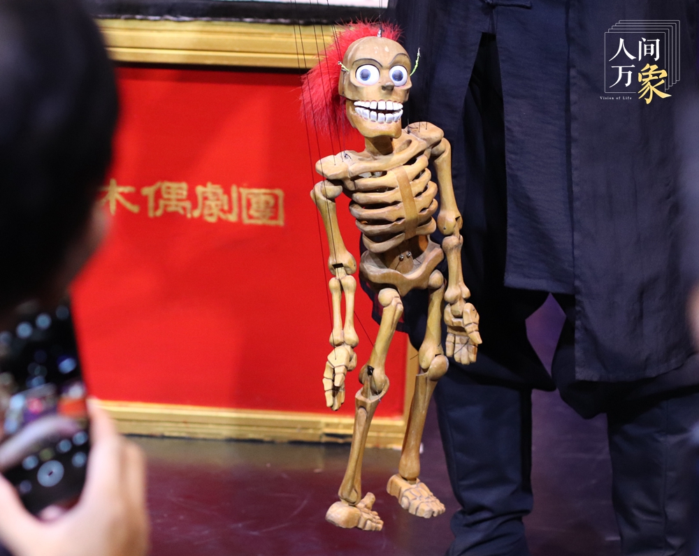深圳新闻网记者魏坤伦从舞台的提线木偶前走过。(张玲 摄)