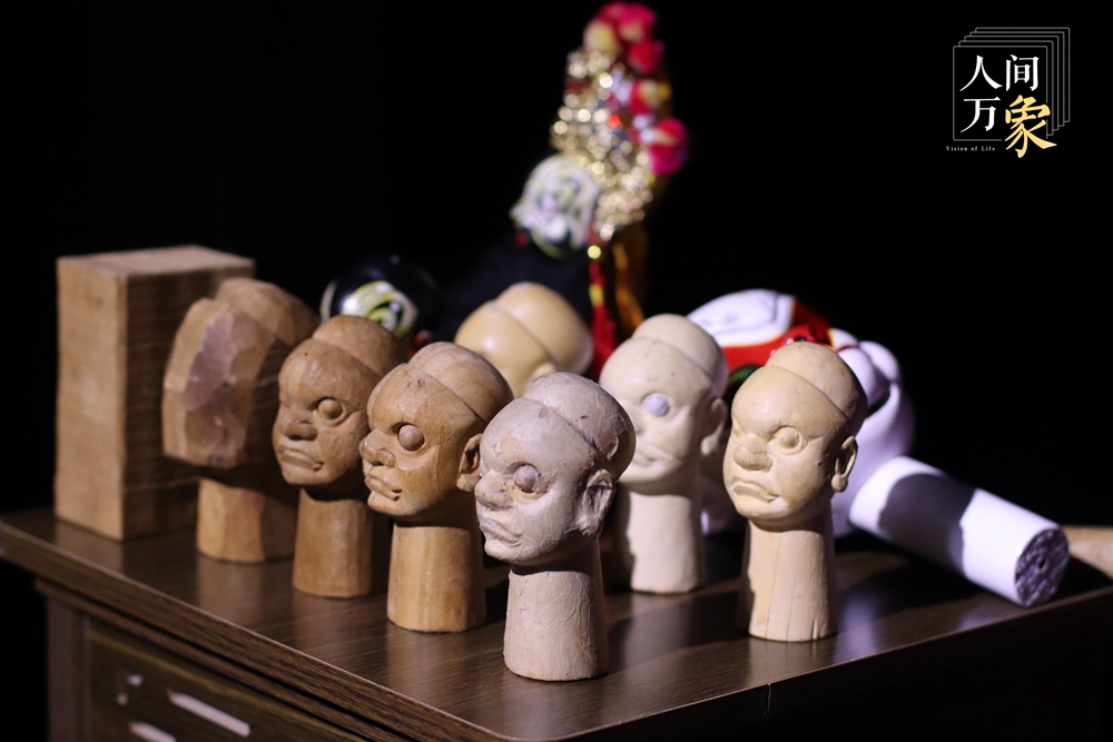 泉州提线木偶的人物制作过程非常精细,图为洪金雕为观众展示的人物头部制作过程。(张玲 摄)