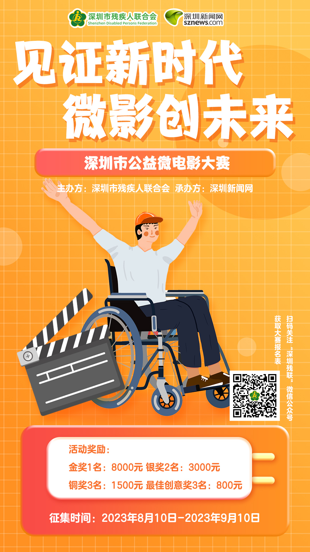 深圳新闻网2023年8月10日讯(记者 林恒鑫 童小晋 冯牧原 阎思远 实习生 陈彦宏)以镜头记录真实生活,用光影传递人间温情。8月10日,由深圳市残疾人联合会主办,深圳新闻网承办的深圳市公益微电影大赛正式启动。作品征集时间为2023年8月10日至9月10日,最高奖金为8000元。参赛者可关注“深圳残联”微信公众号,或登录深圳残联官方网站http://www.cjr.org.cn/领取大赛报名表。