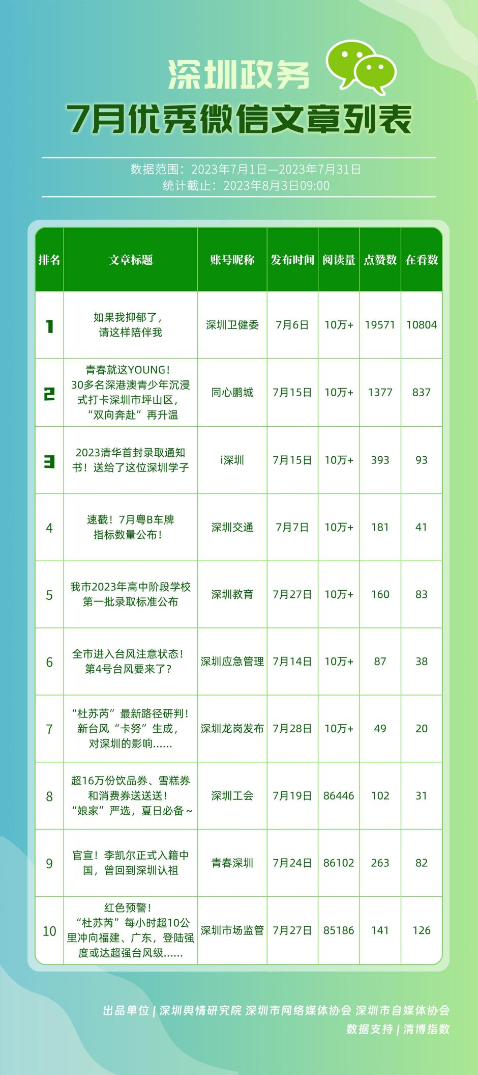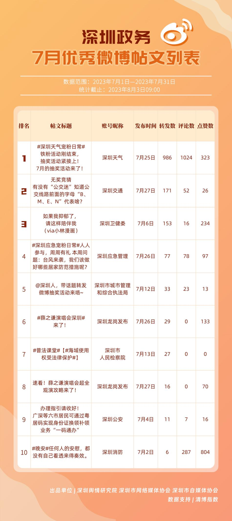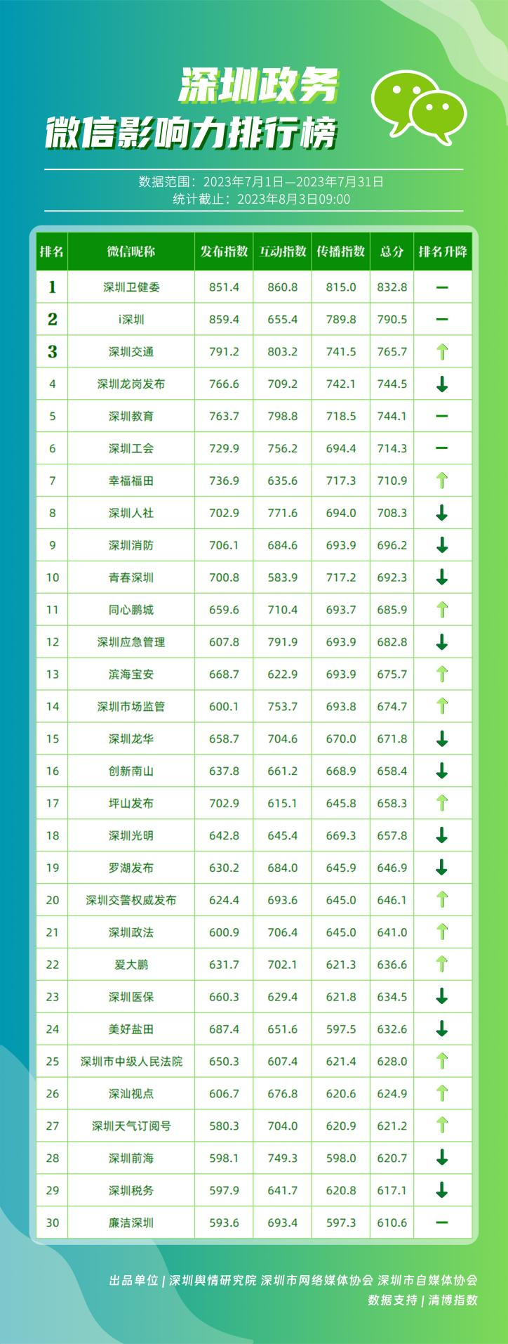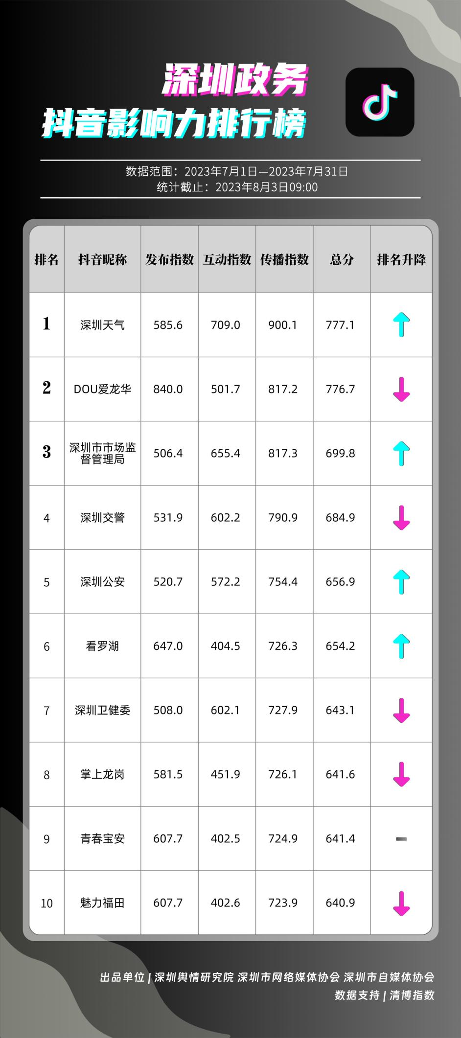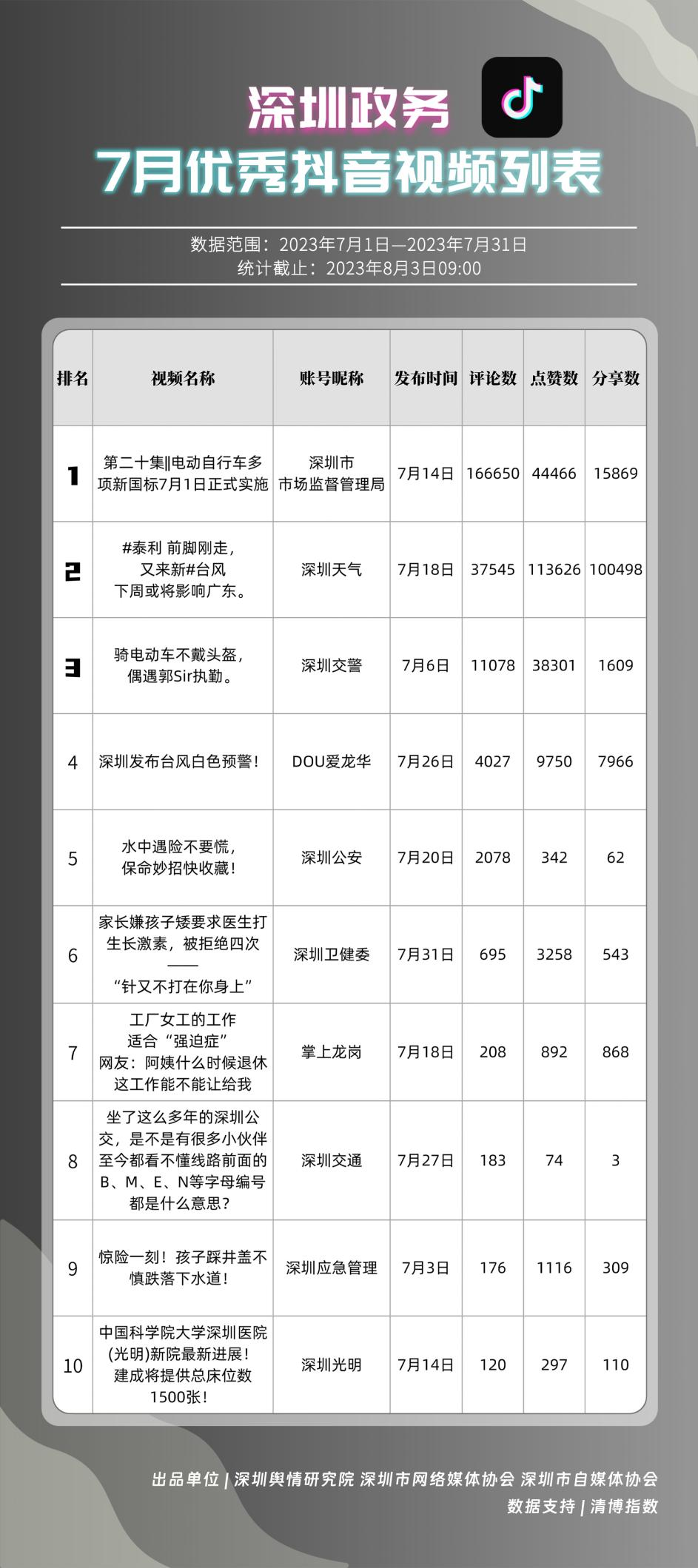 榜单集纳了微信、微博及抖音等多个平台的数据,从发布指数、互动指数、传播指数多项指标入手,评估深圳党政机关、企事业单位政务新媒体的发展水平及公众认可度,最终形成综合榜单1份、各平台榜单4份及优秀作品列表4份。本期榜单统计了158个账号,数据统计时间范围为2023年7月1日至7月31日,截止时间为2023年8月3日09:00。
