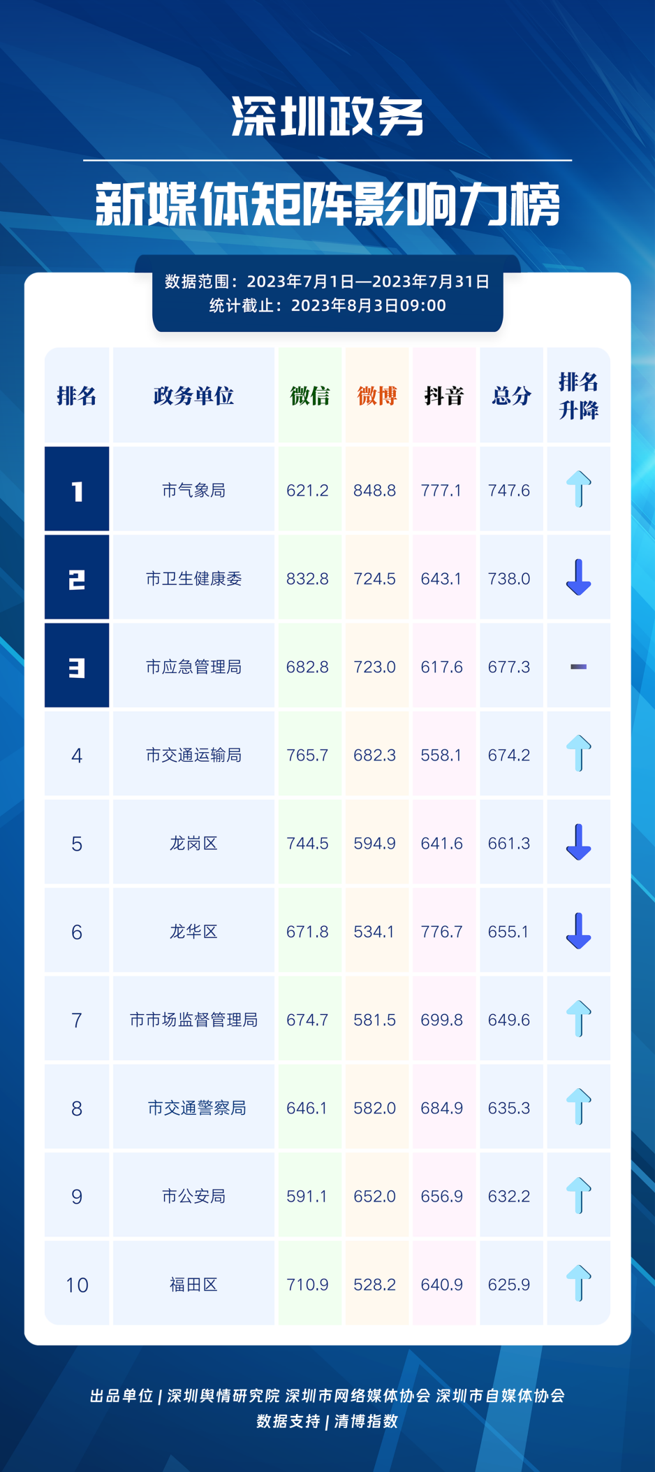 7月深圳政务新媒体矩阵影响力榜出炉 市气象局747.6分居榜首