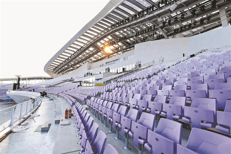 深圳欢乐剧场坐落于宝安区欢乐港湾西侧,集水域舞台与陆域看台于一体,总建筑面积约5470平方米。深圳欢乐剧场项目品牌推广负责人周靖惠介绍,水域舞台面积约3790平方米,为全国最大户外水上舞台。陆域看台设置固定座席约2500座,固定看台两侧可扩展约5500个临时座位,合计约8000座,此外还可以加设内场座位,满足多元观演需求。记者在现场看到,内场距离舞台仅数米,即便是固定看台的最远坐席,距舞台也仅约70米。此外,为确保两侧临时座位的观演效果,此次首演时舞台将增设两块大屏。