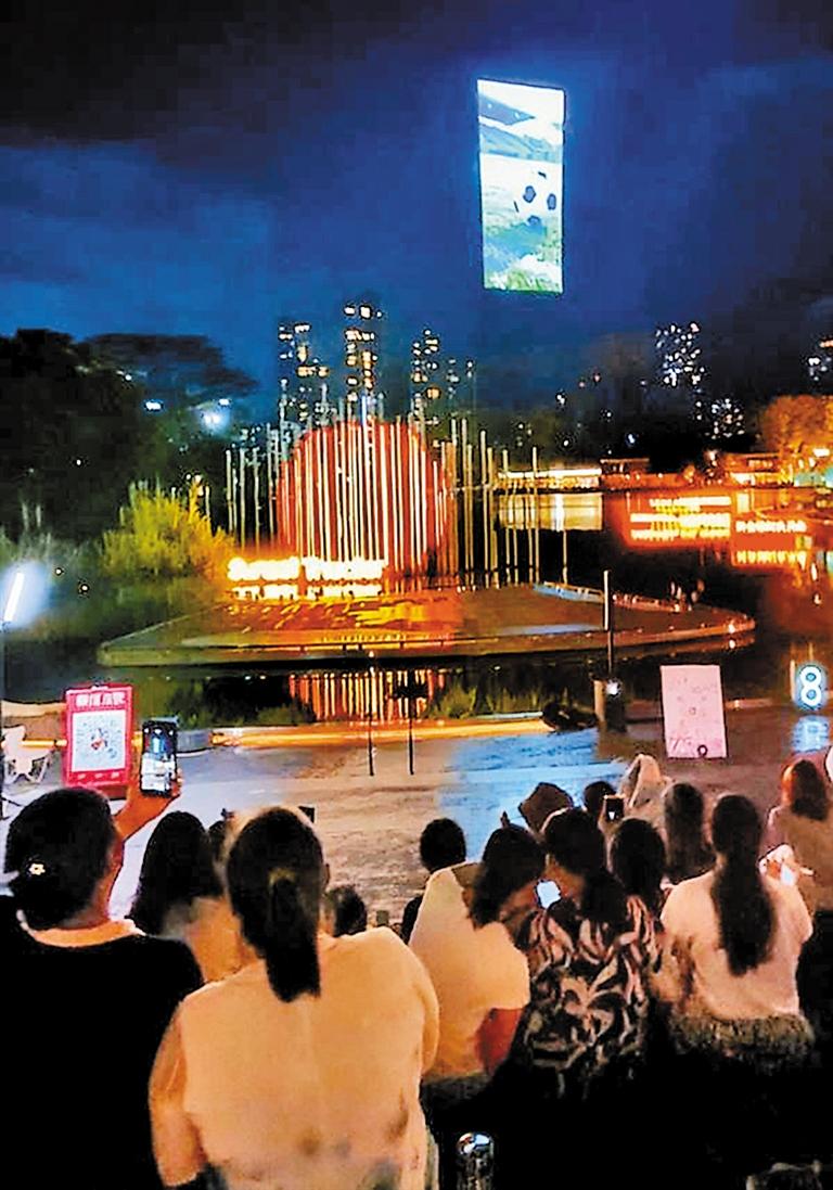 由深企御光新材料打造的飞天屏已多次在此上天“刷屏”,再次亮相依然十分“吸睛”,很快就吸引了商业街区里众多市民的目光,大家纷纷举起手机记录下这一精彩的夜空美景。记者了解到,全运会足球男子U18组已在深圳开赛,当天的飞天屏表演正是为十五运会打Call而来。